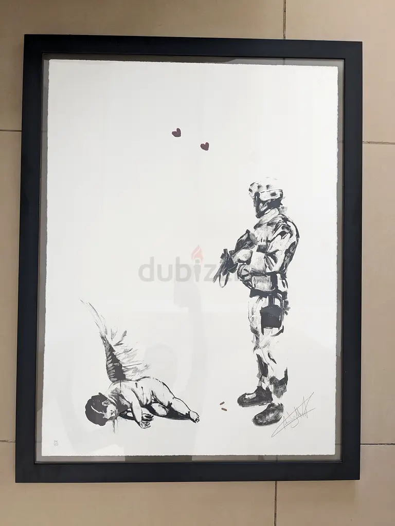 I am selling a professionally framed, authentic, and original screenprint by renowned British artist Antony Micallef, titled "Friendly Fire."