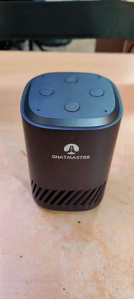 I’m selling a brand new ChatMaster AI powered smart speaker, compatible with Alexa. I never used it — it’s in excellent, unopened condition. It’s a compact cylindrical speaker with four control buttons on top and a matte black finish. Works as a voice assistant for music, smart home control, timers, and information queries. No warranty included.