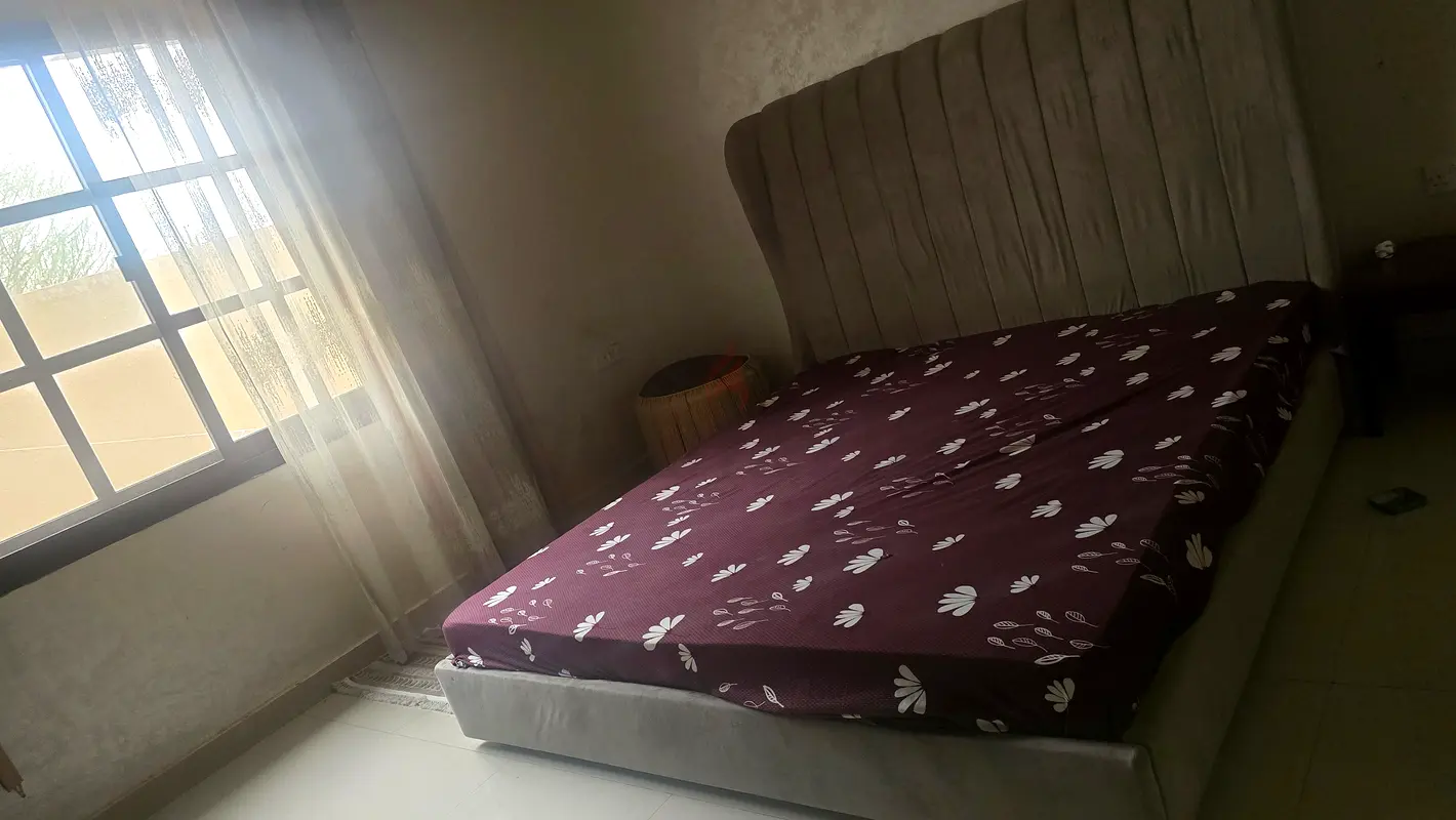 I'm selling my king size upholstered bed frame with mattress in light grey. I bought it from United Furniture about 1–2 years ago and it's in good condition with normal usage marks. The headboard is tall and padded with vertical channel stitching, and the base is fully upholstered in the same grey fabric. I’m including the mattress shown (used, no major stains I can see) and the wooden slats/support are in place and sturdy. Frame and mattress are available for immediate pickup; I can help with loading if needed.